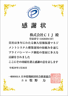 2017年1月 一般財団法人日本情報経済社会推進協会(JIPDEC)より、「プライバシーマーク制度貢献事業者」として表彰されました。